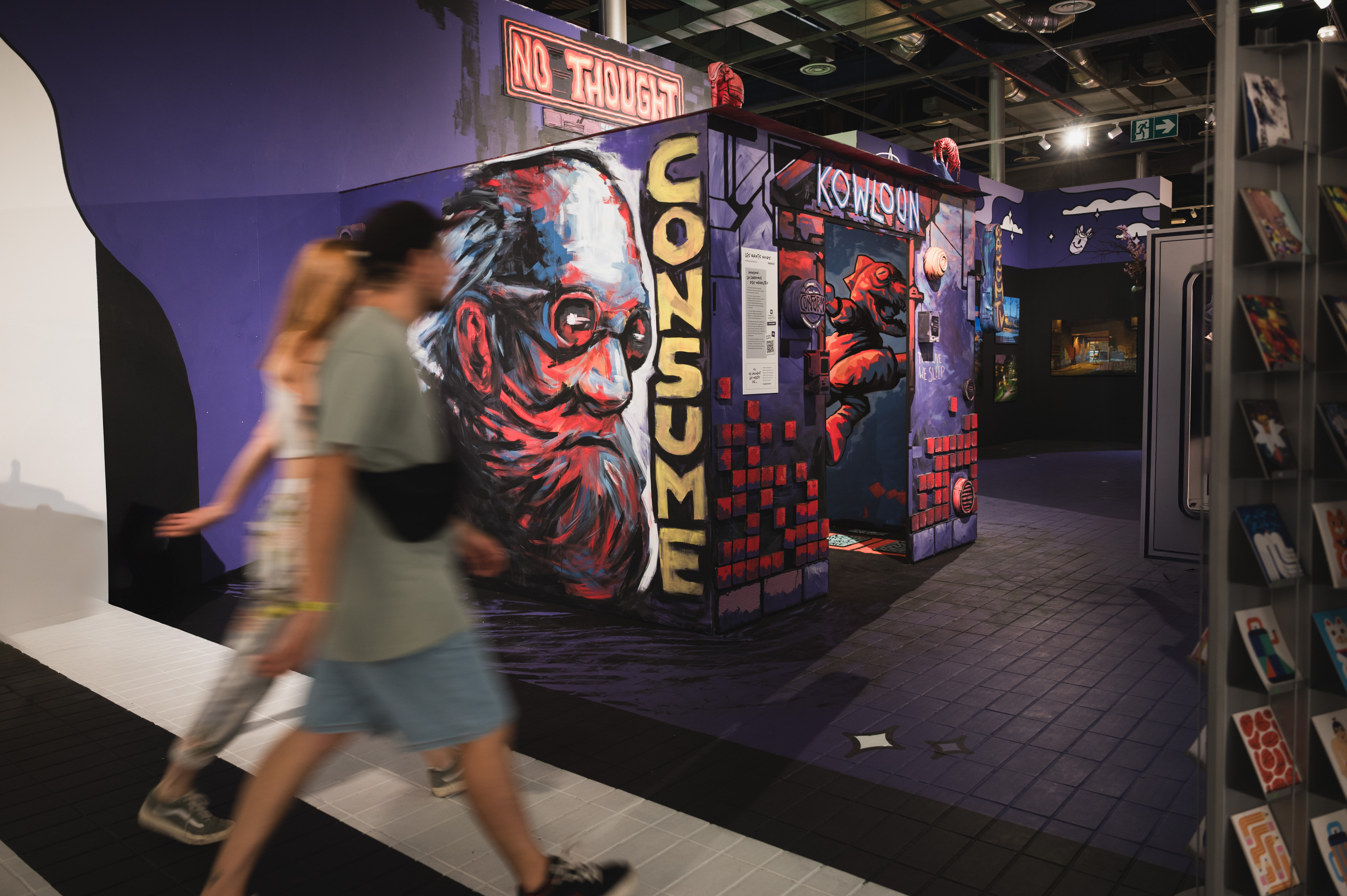 Et cette métamorphose démarre dès la Place Carnot : deux fresques monumentales, réalisées par les Toki, Gaspard Mariotte et le duo Muz Mural Media, habillent la façade du Centre d’Echanges de Lyon Perrache. Elles donnent le ton du festival et invitent les festivaliers à rejoindre le 4e étage. Une fois arrivés, le dépaysement est total, le public se retrouve totalement immergé dans ce terrain de jeu artistique !