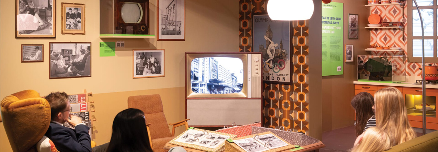 Nous voulions éviter une exposition linéaire ou encyclopédique. Les capsules permettent de plonger dans une époque de manière immédiate, presque sensorielle. Par exemple, la première capsule reconstitue un salon familial des années 1950. C’est un espace qui parle à tout le monde : on s’assoit, on regarde les Jeux à la télévision en noir et blanc, on feuillette des journaux. Les visiteurs les plus jeunes découvrent comment on suivait le sport avant Internet, tandis que les plus âgés retrouvent des sensations familières. Cela crée un dialogue générationnel spontané. Et c’est pareil pour les trois autres capsules !
