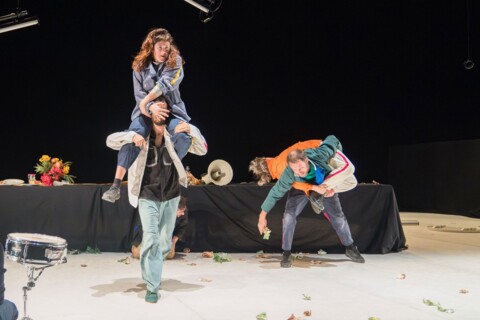 Le spectacle s’articule autour d’une communauté en tension, réunie autour d’un banquet qui tient autant de la cérémonie que du champ de bataille. Les corps s’y croisent, s’y percutent, s’y soutiennent aussi. Dans cet espace mouvant, les situations absurdes s’enchaînent, défiant toute logique apparente, mais révélant peu à peu une forme de cohérence intime : celle de nos propres existences, traversées d’imprévus, d’échecs et de tentatives de reconstruction.