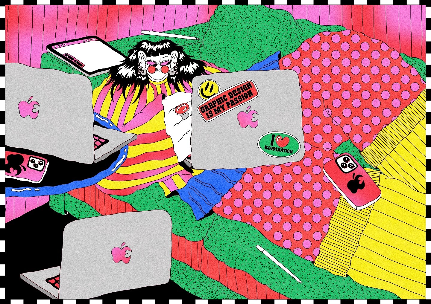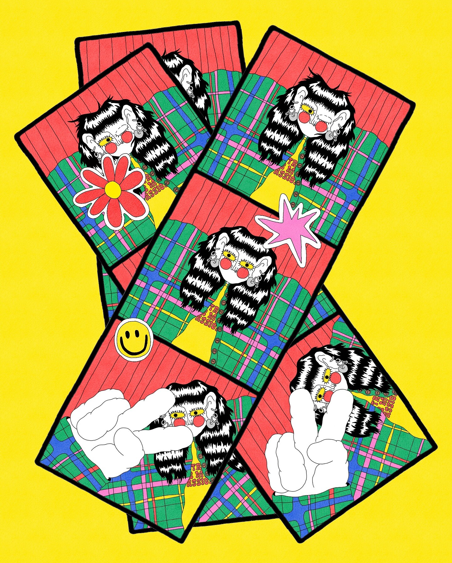 Illustratrice, graphiste et directrice artistique désormais installée à Paris, Justine Jossart appartient à cette génération de créatrices qui brouillent volontairement les frontières entre les disciplines. Son univers visuel est immédiatement identifiable : couleurs franches, compositions pop, personnages aux regards impassibles et humour discret, souvent là où on ne l’attend pas. Un détail, parfois minuscule, suffit à faire basculer l’image, et à déclencher le sourire.