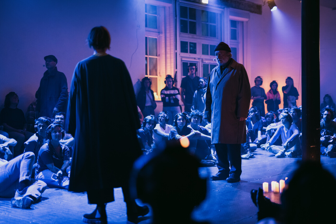 Ici, pas de siège, pas de quatrième mur : muni d’un casque audio, le public déambule à travers les espaces du théâtre, guidé par des voix, des souffles, des lueurs. Trois lieux, trois seuils, trois récits : un jardin suspendu dans le doute, un salon où plane la mort, un royaume peuplé d’ombres et d’innocence. Chaque passage devient un rituel, une expérience intime du trouble et du fragile.
