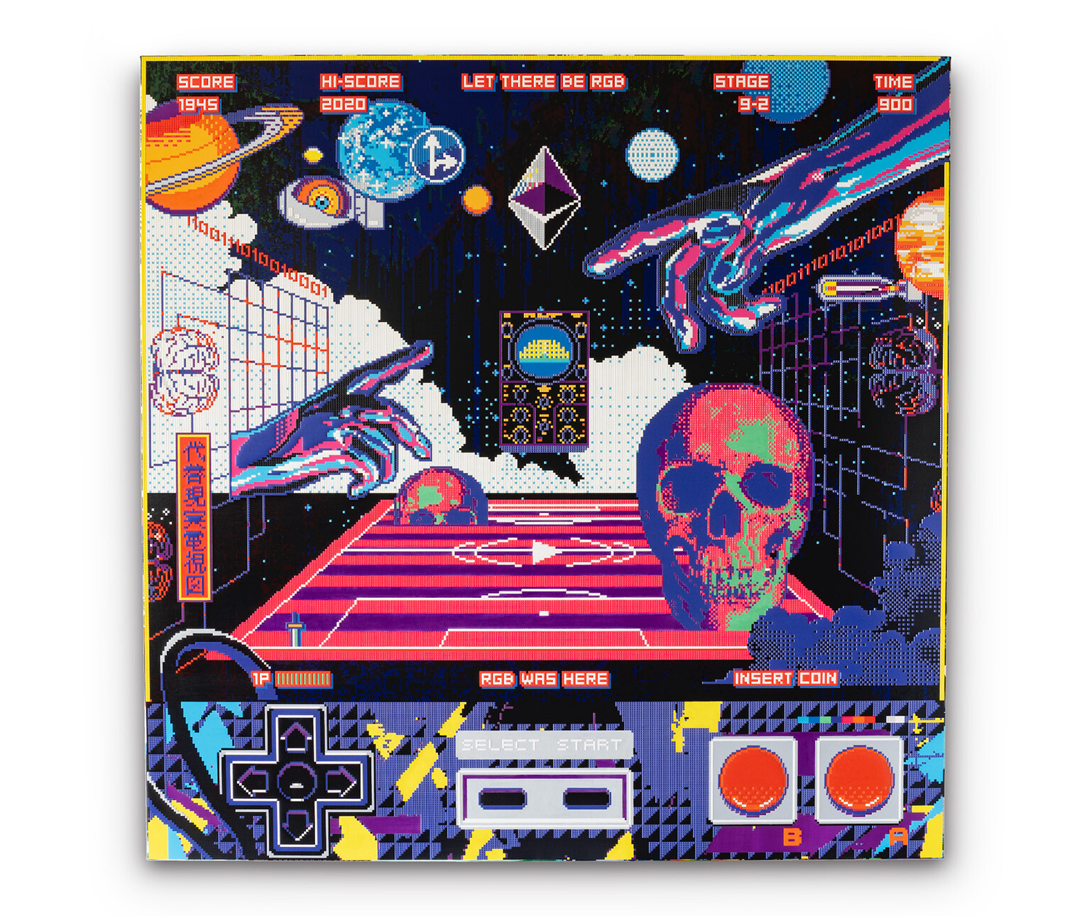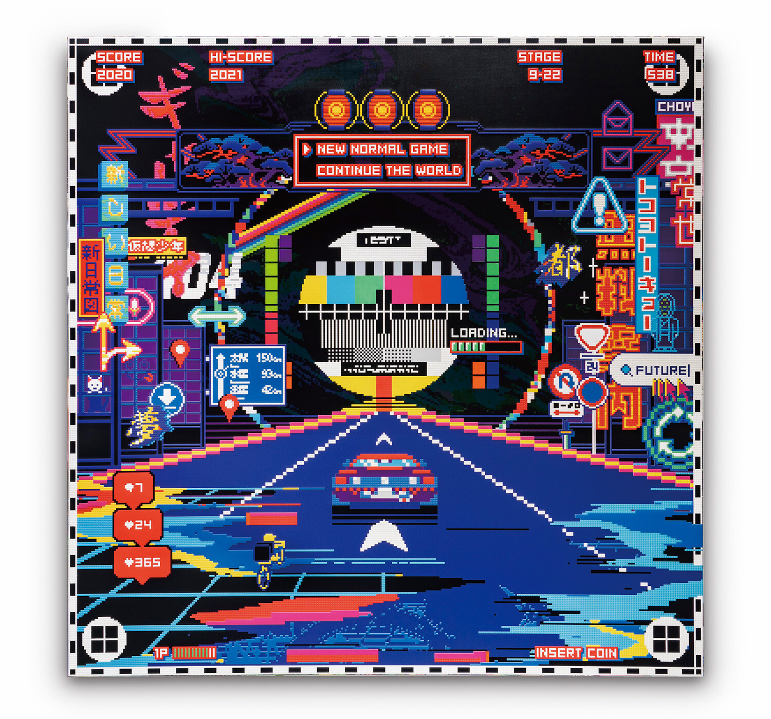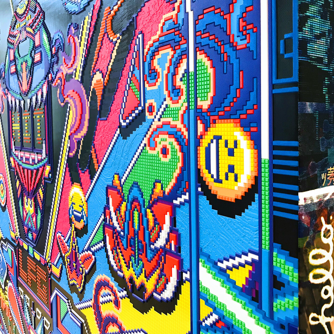 Inspirés par les graphismes de la Famicom (la première Nintendo des années 1980), les artistes transforment l’esthétique du jeu vidéo en langage plastique, pour interroger notre rapport à la mémoire collective et à la simulation du quotidien. Leur démarche brouille les frontières entre art et jeu, spectateurs et joueurs, réel et virtuel. Depuis leur première exposition personnelle à Paris en 2021 (New Game+), Excalibur enchaîne les projets d’envergure : New Void à Rotterdam, la création des visuels officiels de l’Urban Art Fair à Paris, ou encore l’exposition de fin d’année à la Sato Gallery, qui a marqué 2024 comme « l’année Excalibur × Sato Gallery ». Une reconnaissance internationale confirmée par leurs participations aux grandes foires de New York, Séoul ou Dubaï. Leur univers pixelisé convoque autant les mythes japonais — comme dans Tokyo Ukiyo.e, où les estampes d’Hiroshige deviennent mosaïques numériques — que des réflexions philosophiques sur la place du mythe, la mémoire et le rôle des images dans un monde saturé de flux. Chaque œuvre agit comme une passerelle entre passé et futur, tradition et pop culture, folklore et technologie. « Contemporary is the retro games of the future », aiment-ils rappeler, comme un mantra. Une façon de dire que notre présent, déjà archivé en pixels, sera bientôt relu comme une matière nostalgique, à l’image des jeux 8 bits devenus icônes culturelles. Excalibur poursuit aujourd’hui cette recherche avec une énergie renouvelée, en duo artistique et personnel.