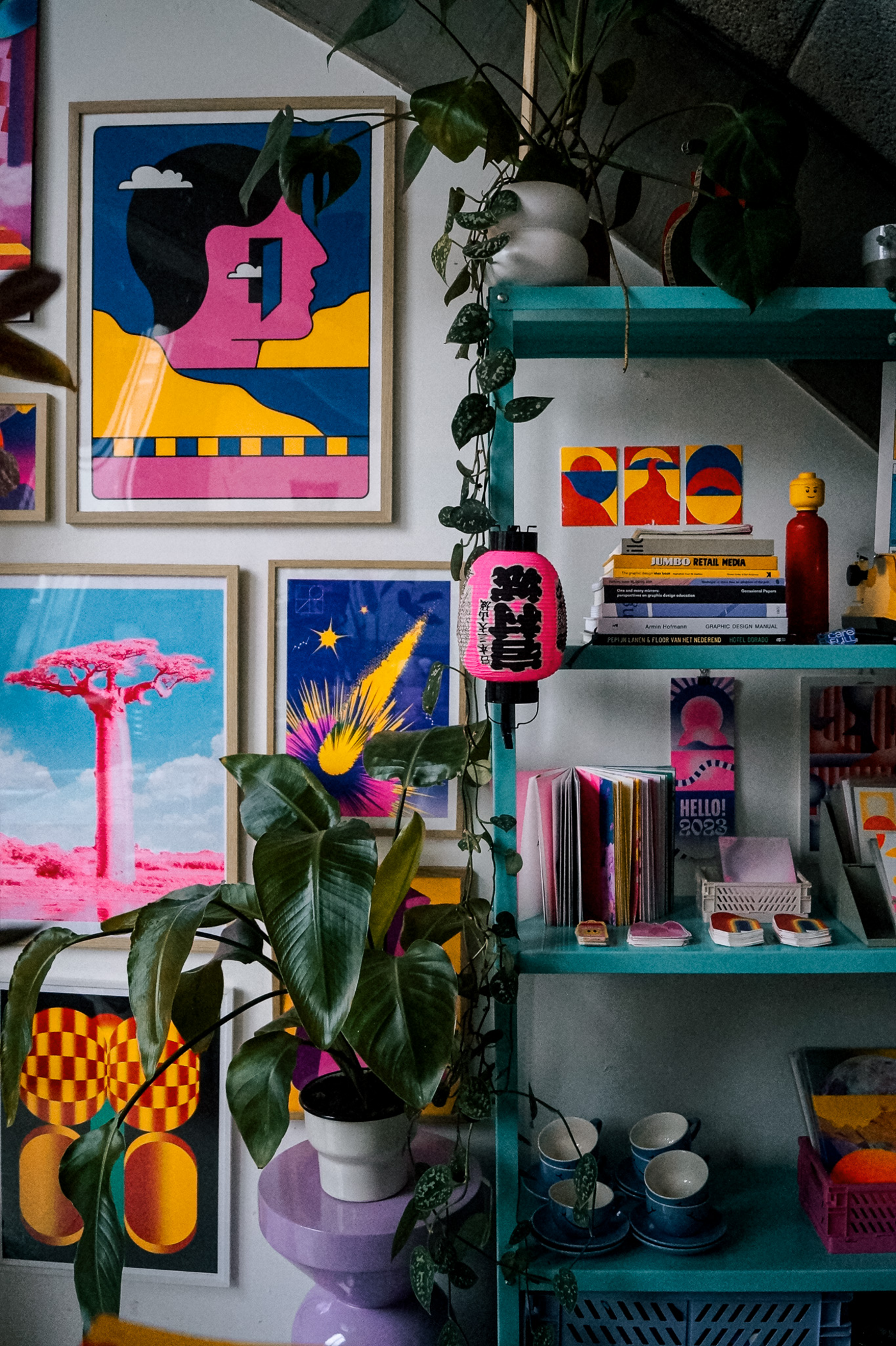 Avec le temps, mon travail s’est construit à la croisée de trois champs : illustration, design graphique et art autonome. Dans le studio que je partage à Utrecht, j’expérimente aussi bien en numérique qu’avec des techniques analogiques, pour des commandes comme pour des projets personnels.