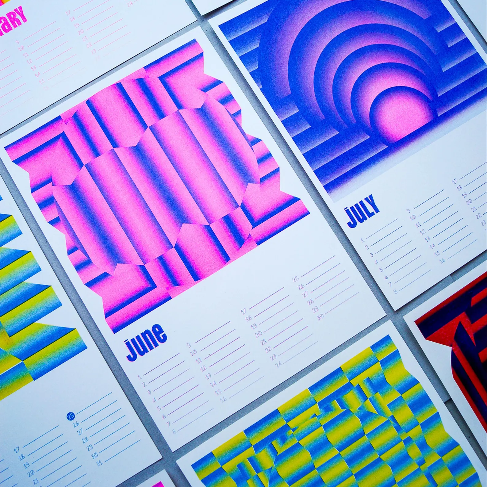 En parallèle, je crée chaque année un calendrier imprimé en risographie. C’est un terrain d’expérimentation où je fais évoluer mon langage visuel — parfois plus typographique, parfois plus illustratif — sans contrainte extérieure.