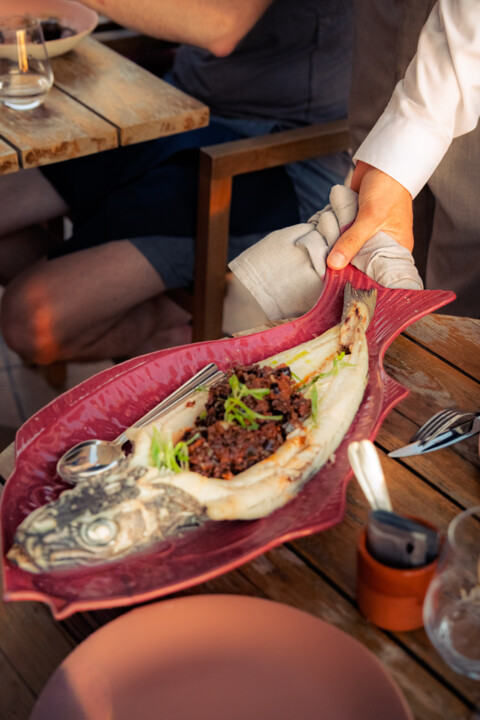 Le décor prolonge cette atmosphère : terracotta enveloppant, fibres naturelles, bois brut et lumière omniprésente composent un cadre à la fois chic et détendu. Un lieu pensé pour s’attarder.