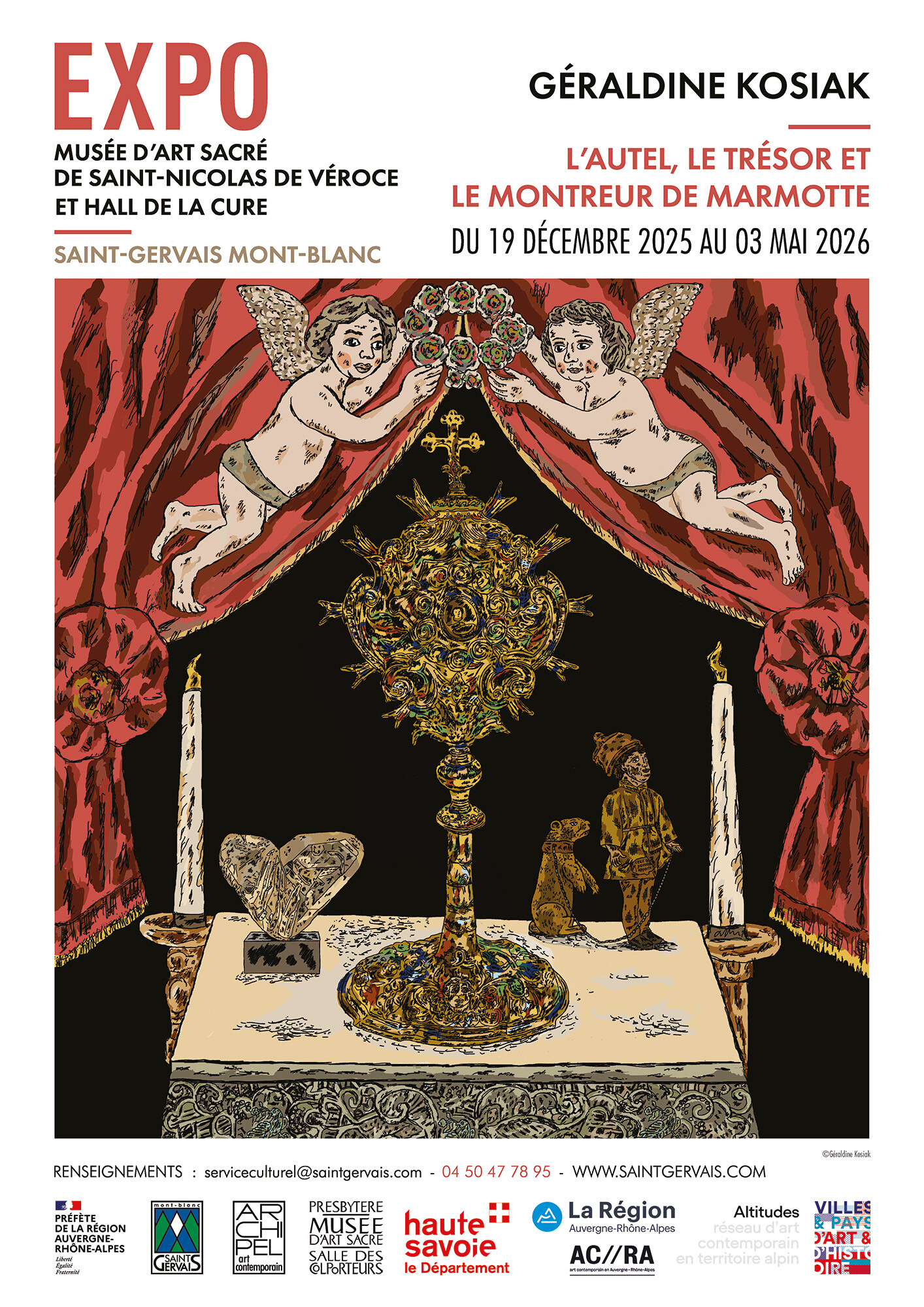 Avec cette exposition, Géraldine Kosiak propose une immersion singulière dans l’art sacré et les imaginaires patrimoniaux. Dessins, peintures, installations et objets dialoguent autour des trésors des églises – manuscrits, chasubles, reliquaires, gemmes ou calices – mais aussi des mises en scène populaires des colporteurs alpins, parfois accompagnés de marmottes apprivoisées.